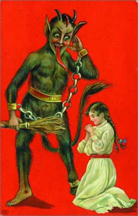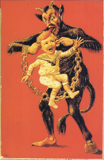 I first came across the Krampus in A Very Venture Xmas (available on the Season 1 DVDs). I didn’t realize that it was real creature. And yet it is. The Krampus originates in Germanic folklore, a demonic creature who would accompany St. Nicholas and punish naughty children. Particularly bad children would be swatted with switches and rusty chains, thenĀ stuffed into the Krampus’s sack and taken away to be devoured or worse.